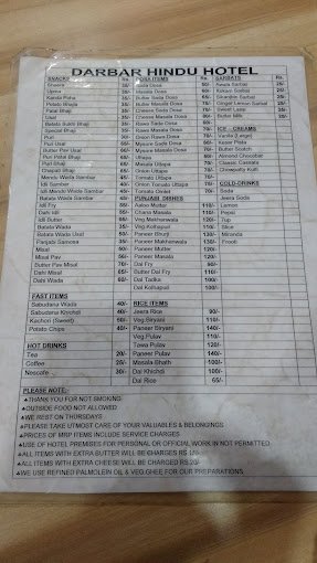Special Darbar Hindu Hotel Menu